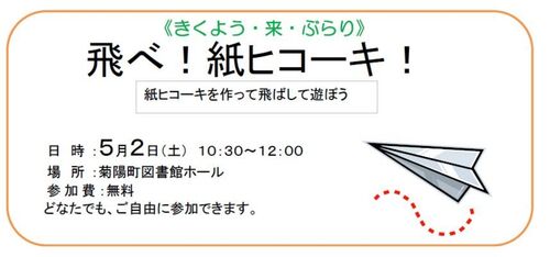 イベント名:「飛べ!紙ヒコーキ!」 日 時:平成27年5月2日(土)10:30~12:00 場 所:菊陽町図書館ホール 内 容:色々な紙ヒコーキを飛ばして遊ぼう! 対 象:どなたでも 参加費:無料 いよいよ明日開催! 会場の様子を紹介していきます。 …