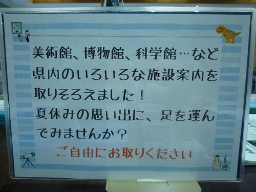 ☆熊本県内の施設案内のお知らせ☆ 夏休みに合わせ、美術館、博物館、科学館など、県内のいろいろな施設案内を取りそろえました! ロビーにて配布しています。 酒造や名所などのパンフレットもありますので、お子様や家族連れだけでなく、大人の方も楽しめると…
