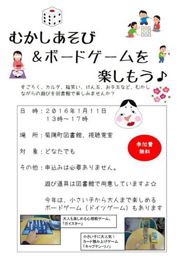 菊陽町図書館は、12月28日(月)~1月3日(日)は年末年始の休館ですが、年明けイベントのお知らせをします☆ イベント名:「むかしあそび&ボードゲームを楽しもう♪」 日時:平成28年1月11日(月、祝日)13:00~17:00 場所:菊陽町図書…