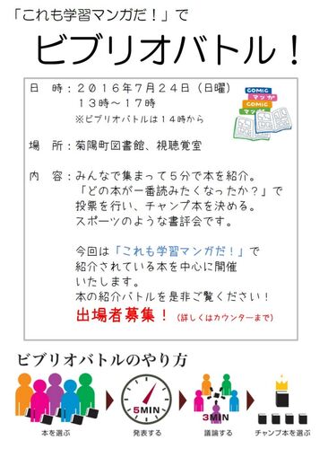 イベント名:「これも学習マンガだ!」(※)でビブリオバトル 日 時:平成28年7月24日(日)13:00~17:00 ビブリオバトル(※)は14:00から。 場 所:菊陽町図書館 視聴覚室 内 容:コミックでのビブリオバトル マンガの面白情報、マンガ…