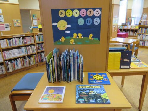 「おつきさまのえほん」 (児童コーナー) 十五夜(中秋の名月)は、一年でもっとも月がきれいな夜です。 今年の十五夜は、10月4日です。 おだんごやすすきなどをそなえてお月見をして、自然の恵みに感謝したいですね。 きれいなおつきさまをながめながら…