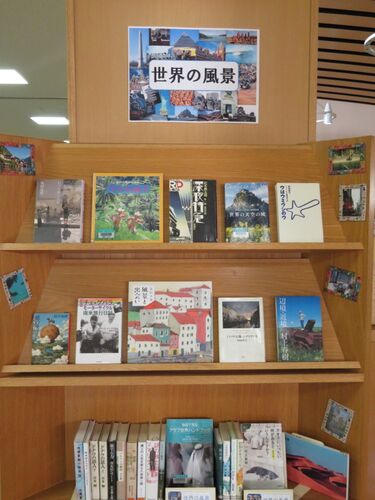 「世界の風景」 (貸出カウンター前) 美しく壮大な自然の景色や、まるで絵画から抜け出したかのように可愛らしい家並み。 世界には普段私たちが目にする景色からは想像もつかないような風景と、 そこに住む人の数だけ様々な暮らしもあります。 海外旅行へ行…