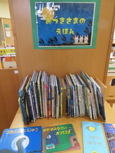 「おつきさまのえほん」(児童コーナー) 今年の十五夜は10月1日です。 みなさん、月の模様は何に見えますか? 餅つきをするウサギ、女性の横顔、カニ、ワニなど 国によって模様の見え方は様々のようです。 月を眺めながら何に見えるか考えるのも楽しいで…