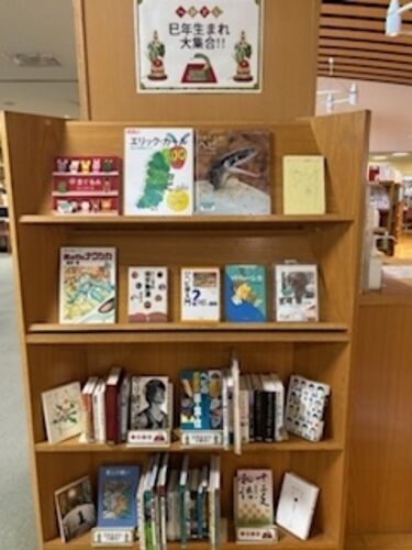 「巳年生まれ大集合‼」(貸出カウンター前) 2025年の干支(えと)は巳(み)です。 巳(み)年生まれの方の作品や、巳(み)を表す蛇に関する本を集めました。 蛇(巳)は、古くから「神の使い」として崇められてきました。 また、脱皮する様子から「復…